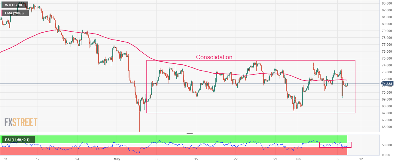 纽约商品交易所(NYMEX)的西德克萨斯中质油(WTI)期货在伦敦交易时段在71.00美元附近横盘整理。油价自关键支撑位69美元反转后陷入震盪。