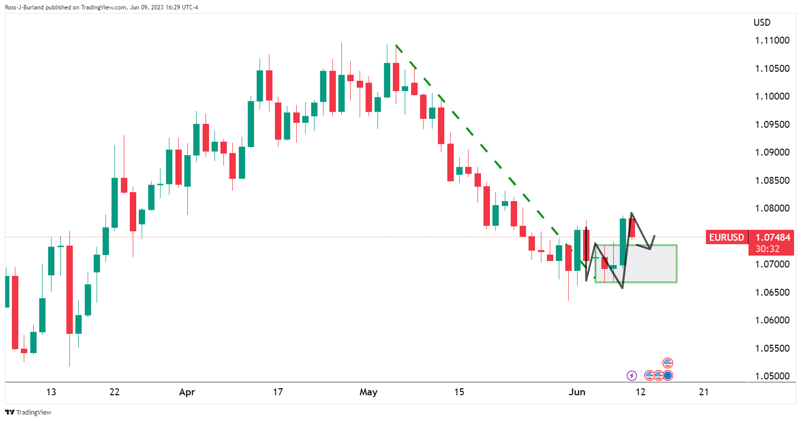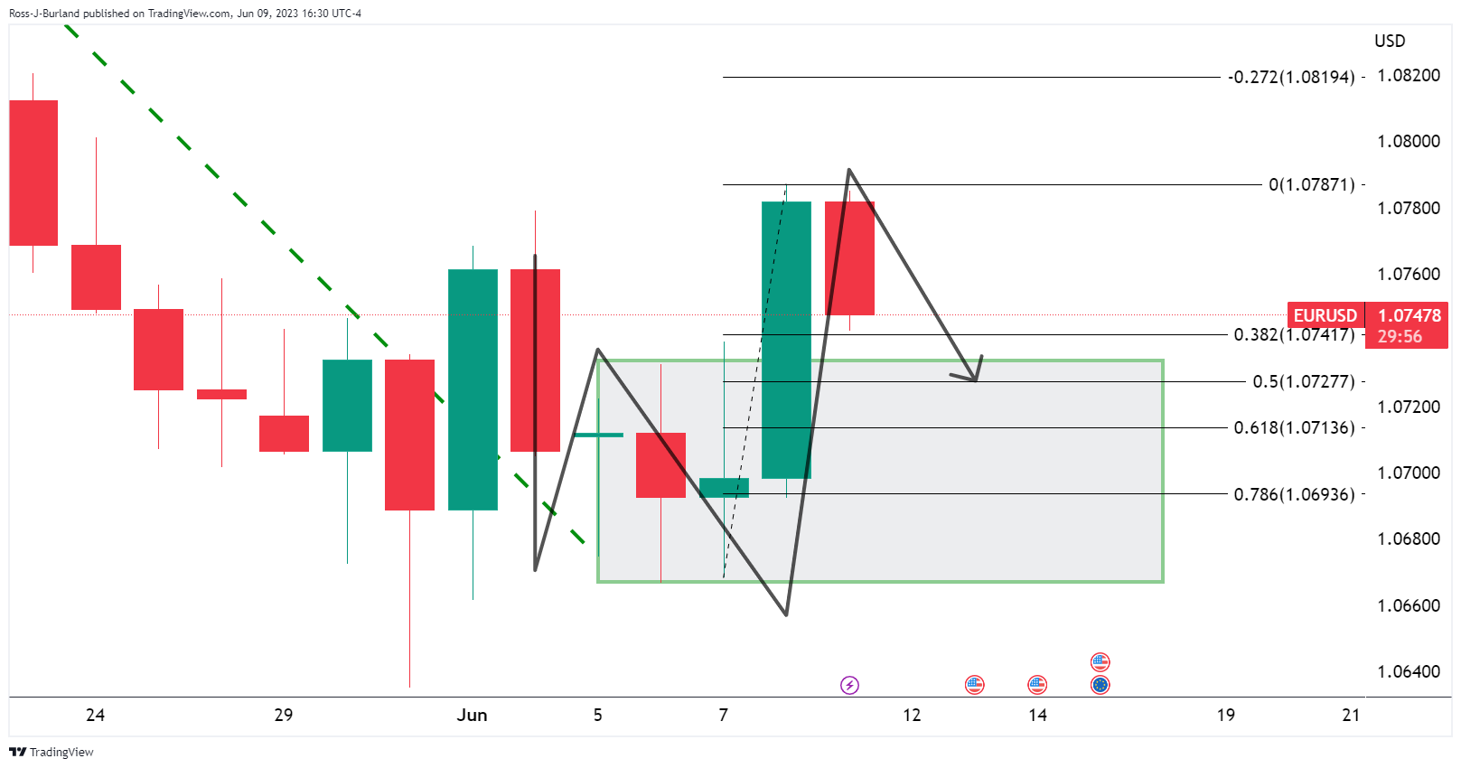 在意大利4月工业生产意外下降引发欧元区经济风险后,欧元/美元上周疲弱。然而,在美联储暂停加息而欧洲央行继续加息的前景下,欧美央行政策存在分歧的情况下,欧元/美元多头蛰伏于整理区间侧面。然而,与此同时空头正介入,并盯著日缐W形态颈缐,如下图: