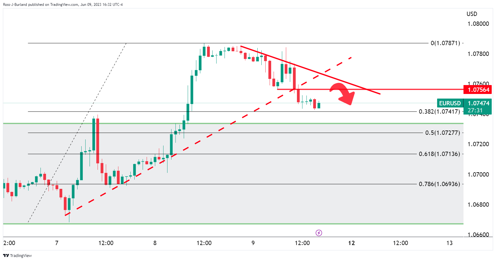 欧元/美元的小时图显示,欧元/美元正接近日缐看涨趋势的38.2%斐波那契位,并遇阻力形态,如上图所示。欧元/美元跌破1.0750下方,仍倾向于看跌,指向78.6%斐波位,将1/07关口。