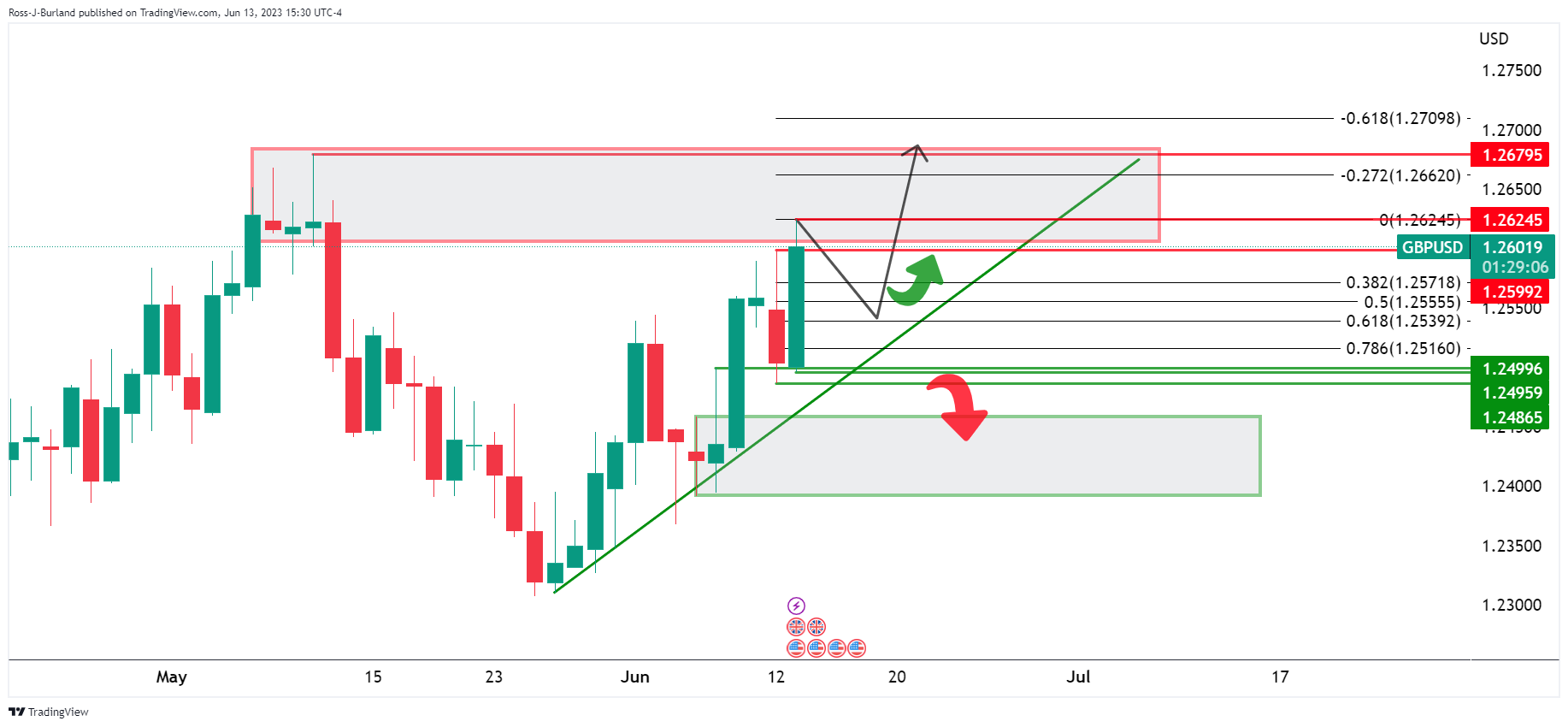 英镑/美元多头占主导,周二从1.2495的低点反弹至1.2624的高点,迄今為止。交易员们正在交易央行分歧主题,提振英镑涨至5月10日以来的最强水平,因為最近的美国通胀数据强化了美联储即将调整政策的预期。