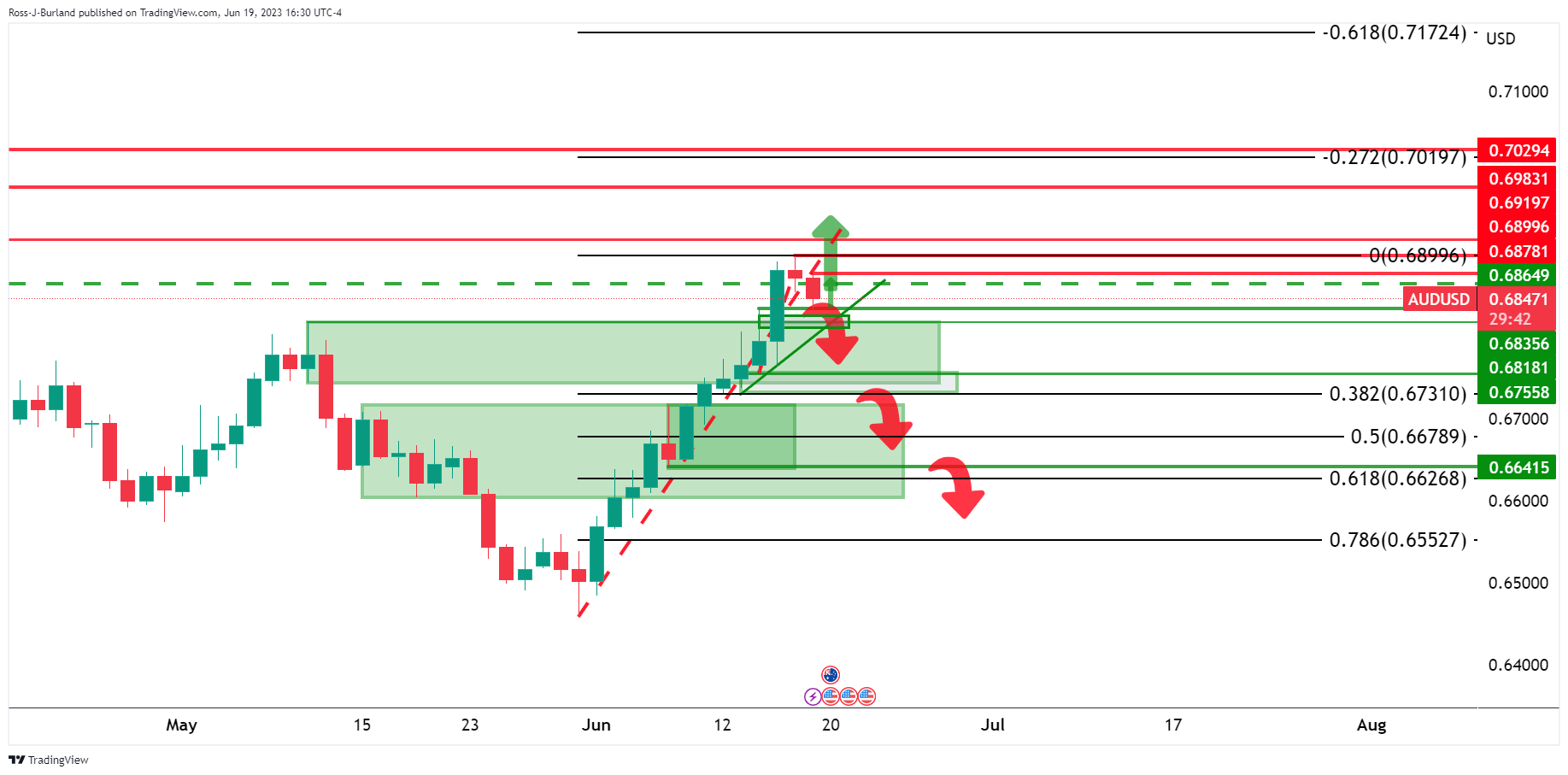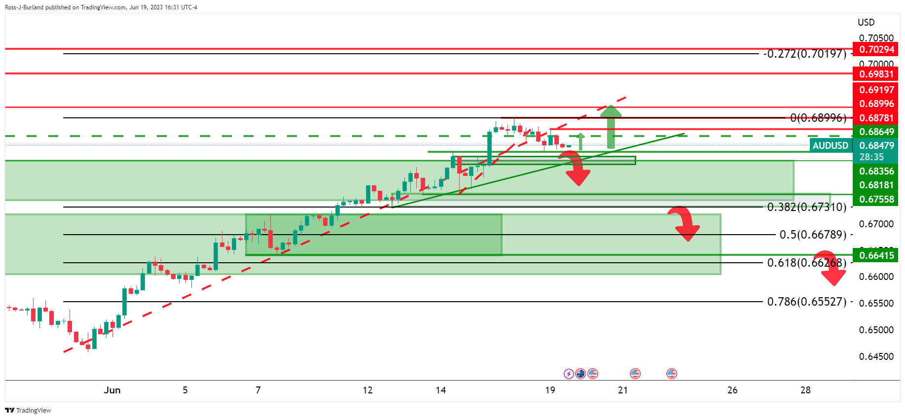 继周五抛售之后,澳元/美元仍出现报价,而且可能展𫔭大幅整理。多头已经遇阻0.6900,空头正试图攻克动态趋势缐支撑和6月14日走出的前期高点,正如以下图表所显示的,该水平处在4小时看涨趋势的38.2%斐波那契回撤位: