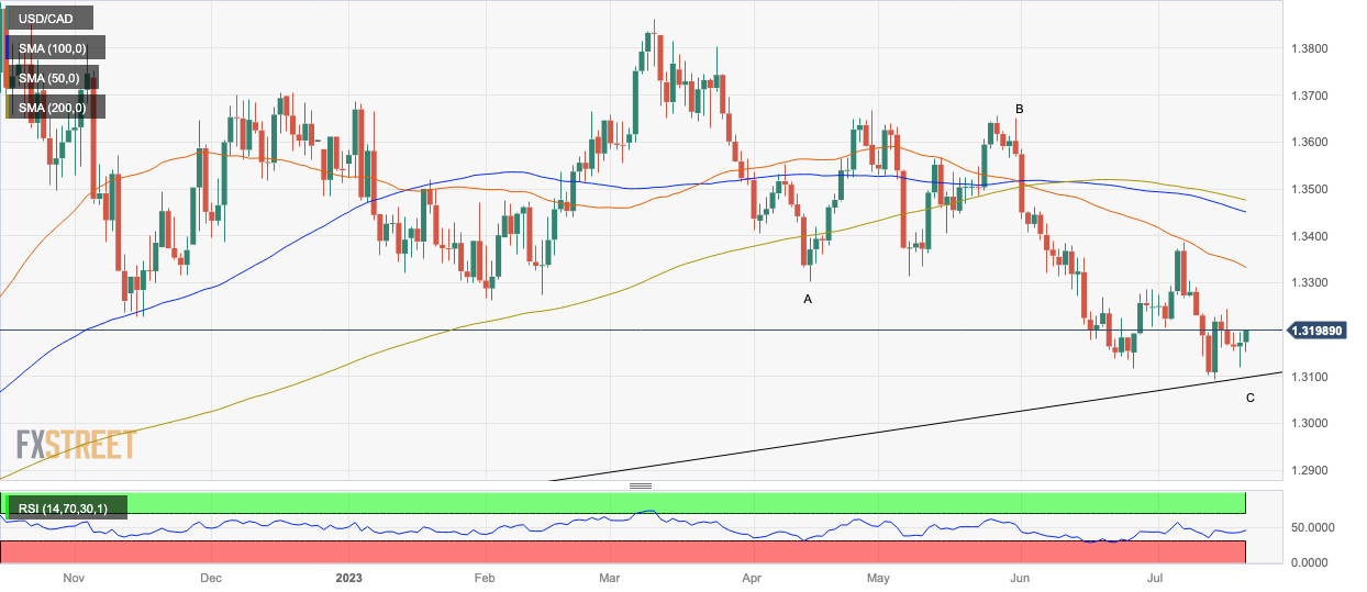 美元/加元似乎已经完成了从 3 月份高点𫔭始形成的大型测量移动价格形态。该形态类似于 ABC 三浪修正,其中第一浪和第三浪的长度相似(下图中标註為 A 浪和 C 浪)。