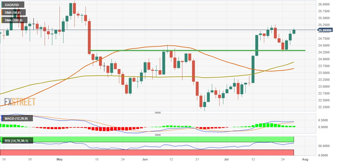 与此同时,技术面有利于看涨交易者,表明 XAG/USD 的上行阻力最小。小时/日缐图上的震盪指标稳居看涨区域,离超𧹒区域还很远,这一事实强化了积极的前景。侭管如此,谨慎的做法仍然是等待 25.25 美元区域或月度峰值之后出现跟进𧹒盘,然后再做进一步升值的布局。