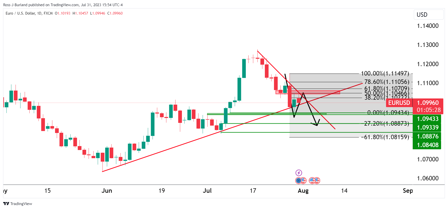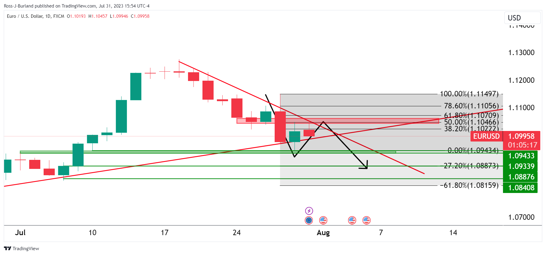 据路透社报导,美联储针对企业和消费者的季度高级贷款官意见调查(SLOOS)也显示,银行预计在2023年剩馀时间内将进一步收紧标准。这是利率上升对经济产生影响的一个迹象,美元汇率已经上涨,推动欧元再次向趋势缐支撑位靠近: