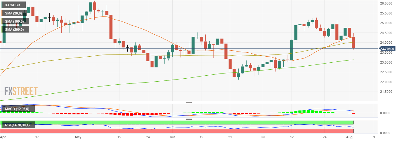 周三盘中,在美元走强的推动下,银价跌至 7 月 12 日以来的最低点 23.70 美元附近。美元指数连续第五天上涨,主要原因是美国经济具有韧性,可能促使美联储(FED)放弃停止紧缩周期。
