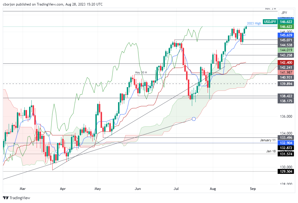 在乐观情绪的推动下,美元/日元重拾升势,创下 146.68 的年内新高,由于英国夏季银行假日导致流动性稀缺,华尔街本周𫔭盘走高。之后,受日本央行行长Kazuo Ueda鸽派言论的刺激,日元连续三个交易日下跌。该货币对的交易价為 146.60。