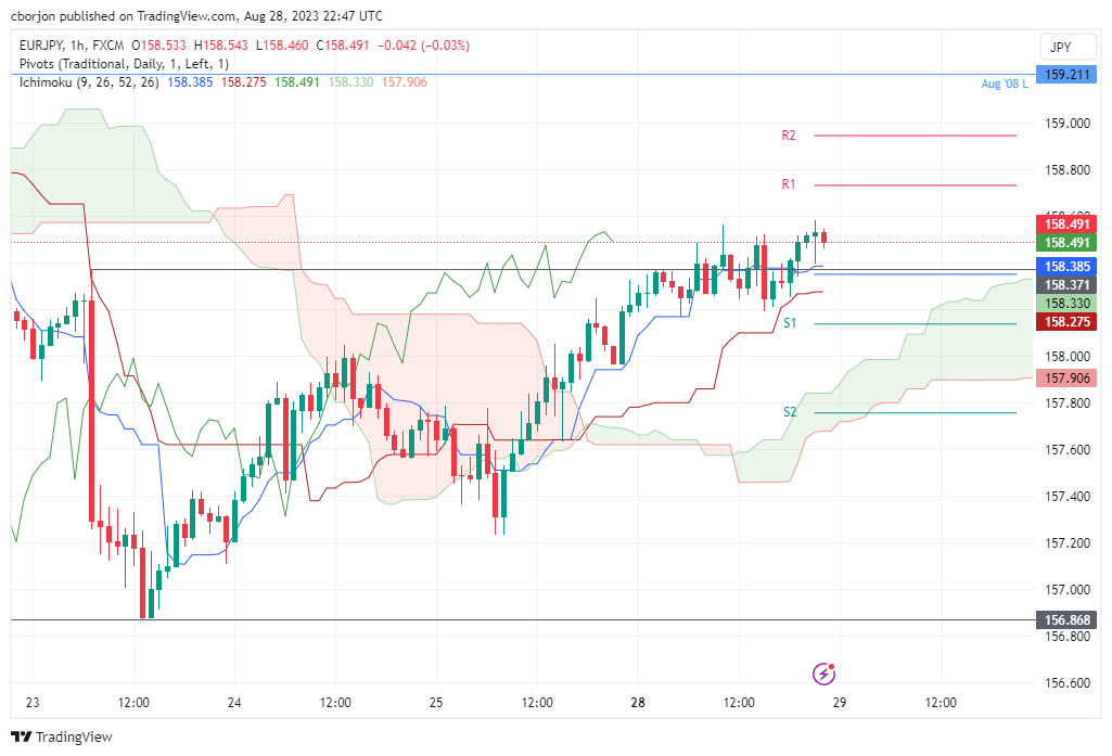 欧元/日元日缐图显示,该货币对呈中性偏向,但略微偏向下行,因為欧元/日元日低点处在 8 月 18 日的震盪低点 157.65下方。然而,最近的上涨可能為重新测试 159.21 的年初至今(YTD)高点铺平道路,除非欧元/日元跌破转换缐 158.18,然后是158.00 关口。一旦跌破,下一个止损点将是 8 月 23 日的日低点 156.87,然后是一目均衡表云(Kumo)顶部 155.96。