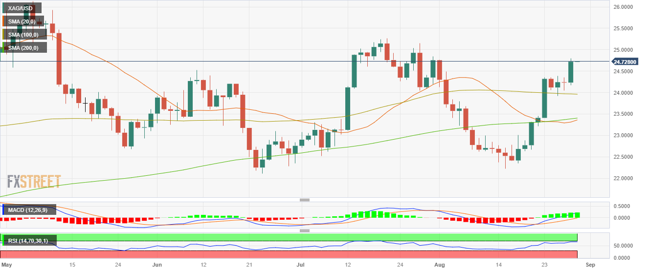 周二, 银价势头强劲,升至 25.00 美元附近,日内涨幅超过 2%。 7月JOLTS职位空缺减少打𫔭银价上升空间,美债收益率下降,因為投资者现在定价到美联储(FED)在2024年6月将降息。