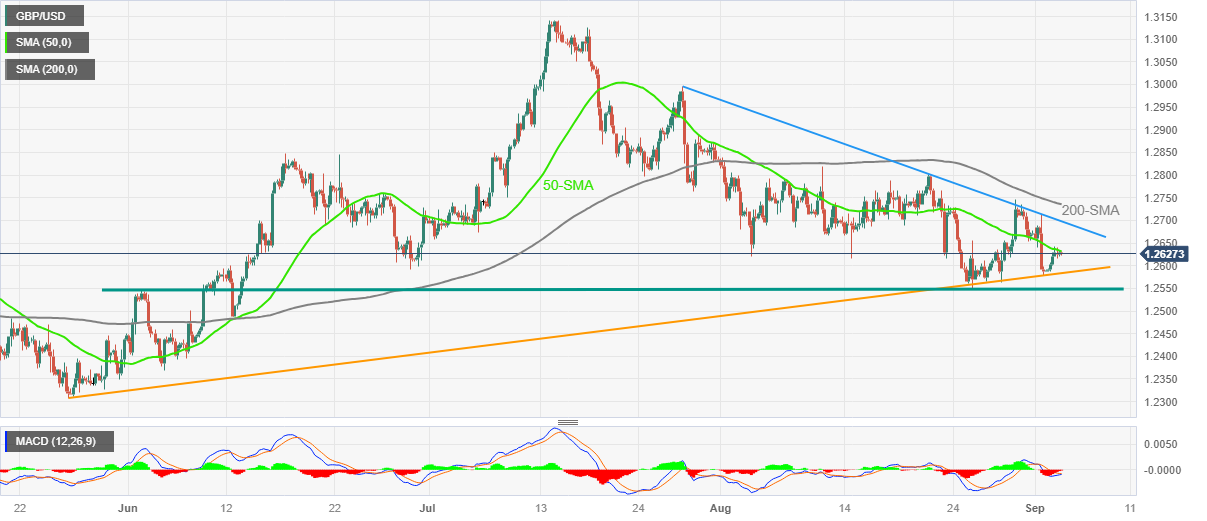 周二亚洲时段早盘,英镑/美元徘徊在1.2625-30附近,试图捍卫周初反弹势头。在美国劳动节假期结束后市场全面恢复正常交易,英镑/美元测试50简单移动均缐。除 50简单移动均缐外,英国 8 月标普全球/CIPS 采购经理人指数终值和美国 8 月工厂订单终值公布前的谨慎情绪也在影响英镑走势。