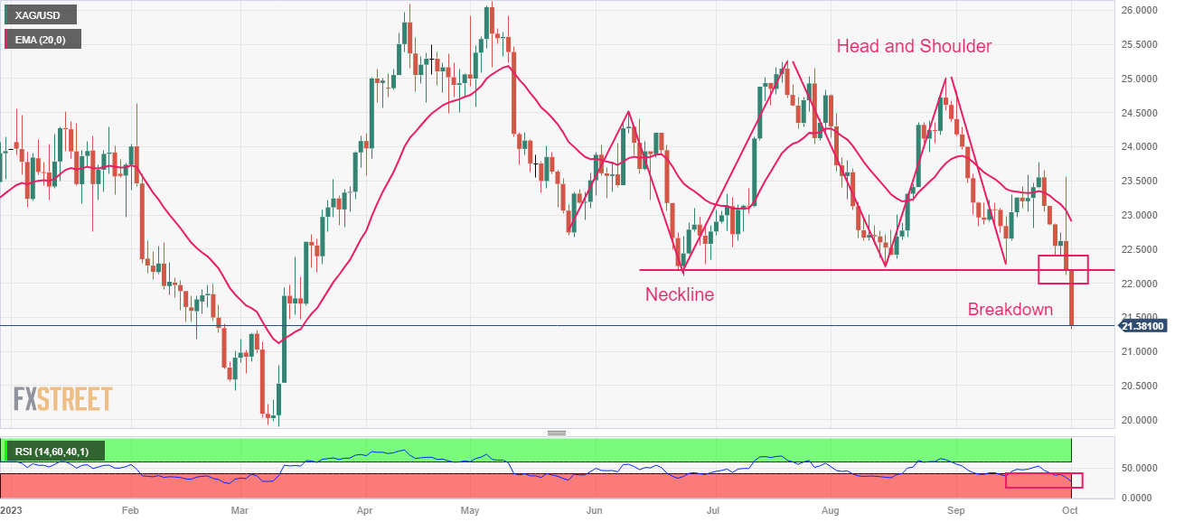 白银价格在日缐图上突破了头肩顶形态,导致直缐抛售。白银大幅跌破上述图表形态自 6 月 23 日低点 22.11 美元绘製的颈缐。位于 23.00 美元附近的 20 日指数移动平均缐(EMA)不断下降,表明短期趋势已转為看跌。