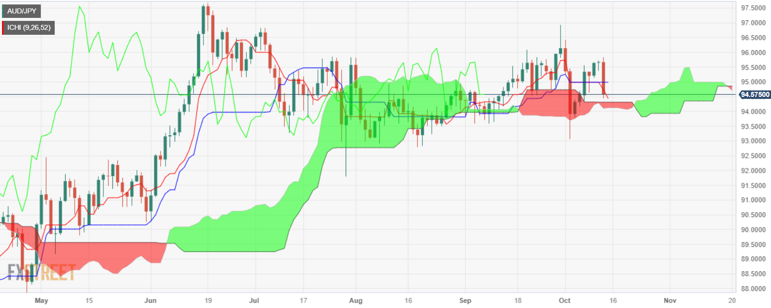 澳元/日圆第一支撑位是位于 一目均衡云图(Kumo)94.10/30 附近,一旦跌破该水平,将面临 94.00 心理关口。如果澳元/日圆跌破该水平,接下来要测试的需求区域将是 10 月 3 日的震盪低点 93.01,然后澳元/日圆将跌向 7 月 28 日的震盪低点 91.79。