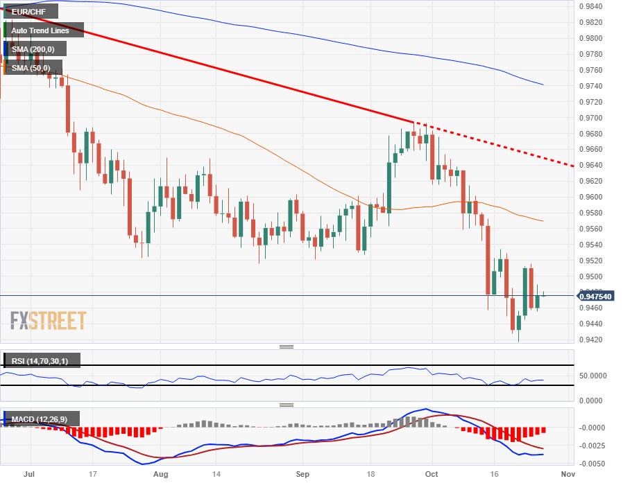 - 进入星期四后,欧元/瑞郎不断走高,目前交投于 0.9475 附近。