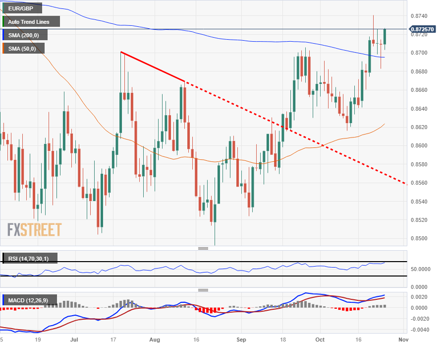 欧元/英镑正在测试近期高点0.8700关卡上方,周四时段欧元/英镑触及日缐高点0.8725上方。