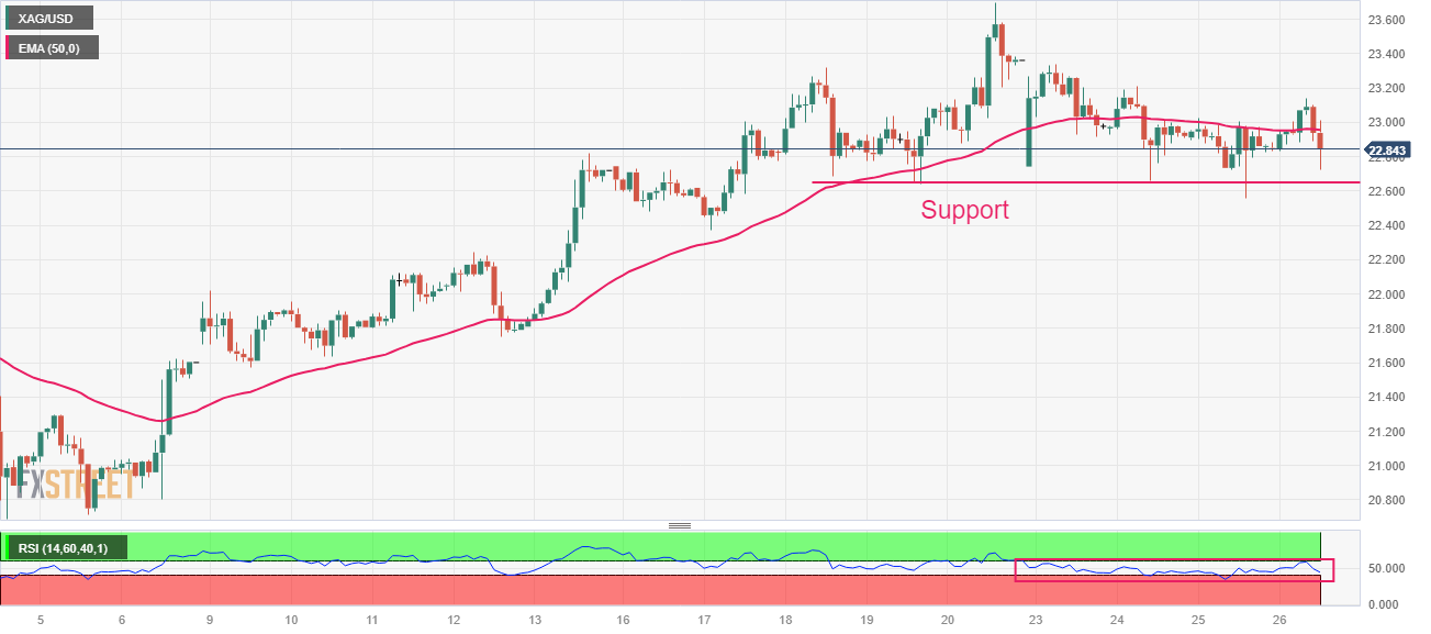 - 银价在 22.65 美元附近的水平支撑位附近盘整。