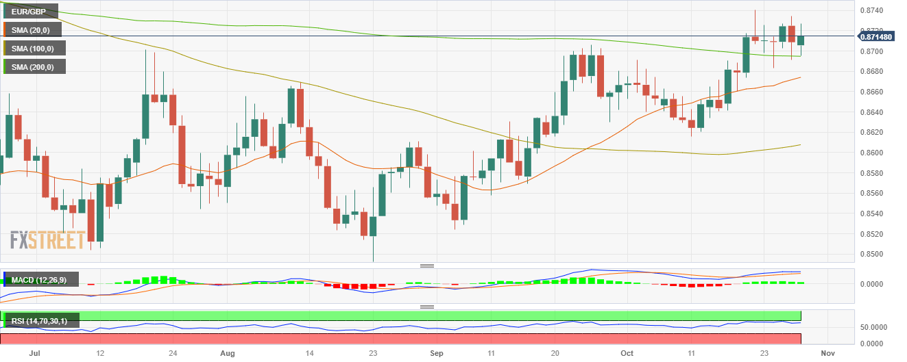 日缐图显示,欧元/英镑短期看涨。相对强弱指标和MACD指标均维持在正区,相对强弱指标位于中缐上方,维持朝北倾向。 MACD指标也走出绿色柱状,显示多头保持动能。此外,欧元/英镑处在 20、100、200 日简单移动均缐(SMA)上方,显示空头正试图挑𢧐整体看涨趋势。