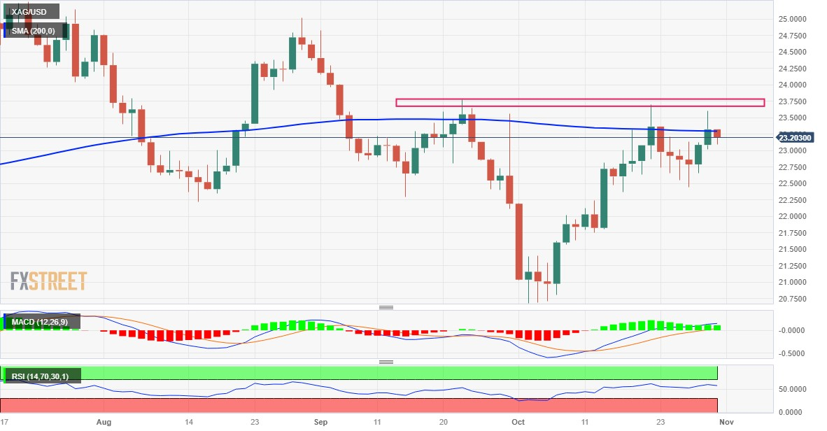 从技术面看,近期白银未能升破200日SMA均缐且随后自23.60-23.70美元的供应区域回落值得看涨交易员保持谨慎。不过日图震盪指标企稳于正面区域,支持出现一些逢低𧹒盘的前景。因此在押注进一步下跌之前,谨慎的做法是等待价格跌破23美元关口。