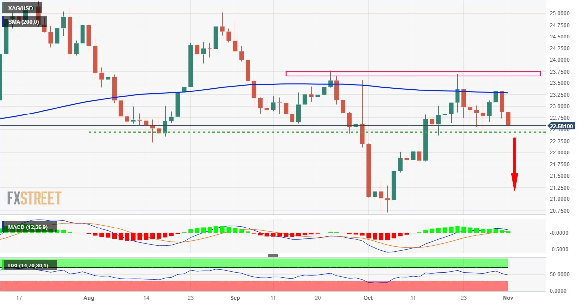 从技术角度来看,近期屡次未能升破200 天简单移动平均缐(SMA),并在 23.60 美元至 23.70 美元的供应区附近遇阻,这构成了看跌的多重顶部形态。再加上日缐图上的震盪指标再次𫔭始获得负面牵引力,这表明白银/美元的下行之路阻力最小。