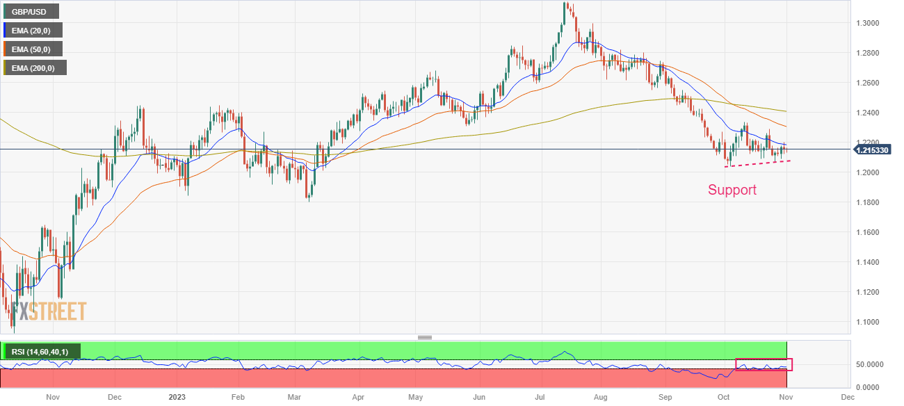 英镑在 1.2150 附近徘徊,投资者在等待联准会和英国央行的货币政策决定。近期前景依然看跌,因為 20 日指数移动平均缐 (EMA) 一直是英镑多头的主要障碍。下降的50 天和 200 天 EMA 表明大趋势明显看跌。动量震盪指标显示波动性收缩。