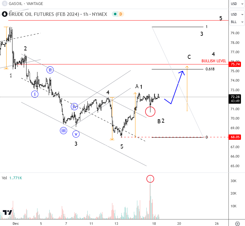 原油上周五大幅走低,但在美国时段稍后价格小幅走高时放量企稳。在北韩向东海发射不明弹道飞弹的消息传出后,能源也保持上涨。从艾略特波浪的角度来看,价格也在觊觎更高水平,我们认為浪C/3的上升空间在 75 美元左右。在这一区域,我们可以看到一些从 12 月初𫔭始的盘整和之前跌势的 61.8%斐波那契回档,这可能会因為五浪下跌而结束,并突破下降通道。