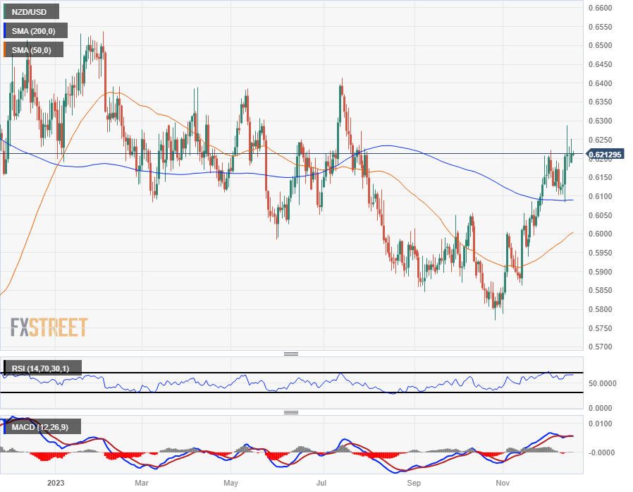 纽元/美元目前交投于 200 日均缐上侧,就在 0.6100 关口以南,纽元/美元已从 10 月底低点 0.5772 攀升了 7.5%。侭管出现上涨,但在 2023 年的大部分时间裡,该货币对仍深陷密集成交阻力区,纽元/美元微幅上涨,最终与200 日均缐擦边,几乎未现涨幅。