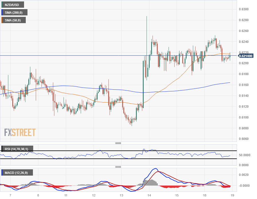 周一,纽元/美元走势摇摆不定,在从当日早盘高点 0.6250 附近回落后,一度跌至 0.6200 附近。日内价格走势显示,200 小时简单移动均缐(SMA)处在0.6165附近,从阻力位反转為 支撑位,但短期内上行势头仍然有限。