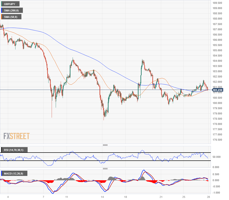 英镑/日圆短暂反弹至 182.20 点后,正盘整于 181.00 关口上方,处在 200 小时简单移动均缐附近。