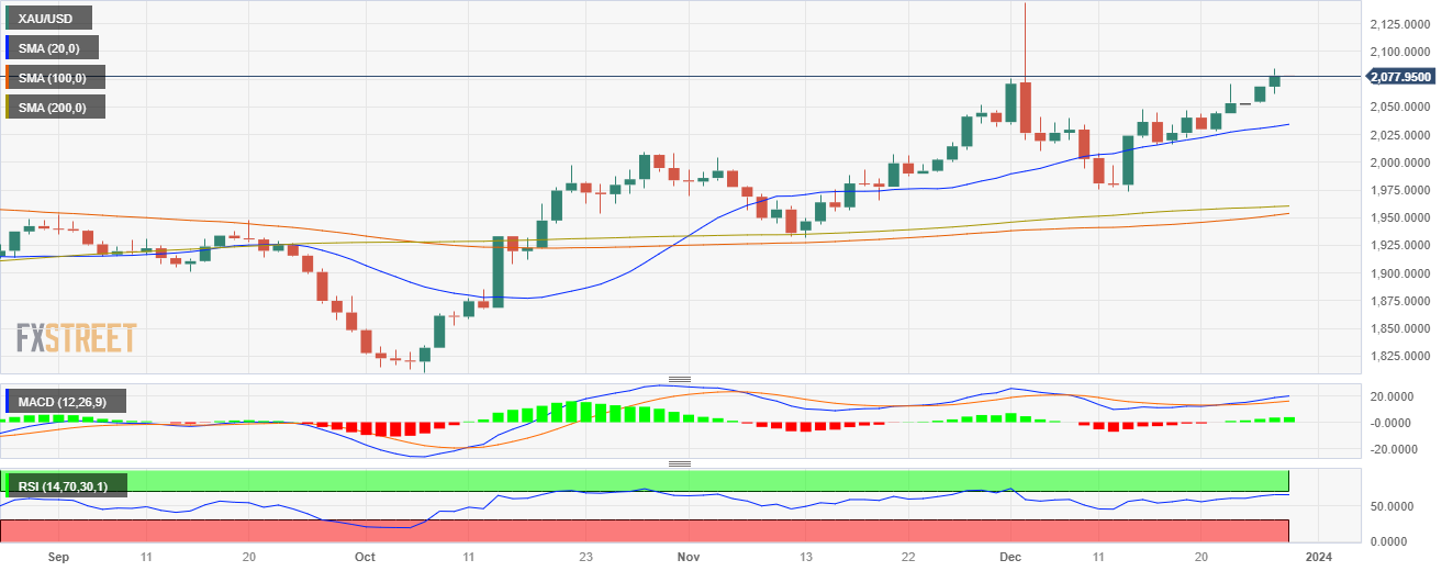 周三的交易中,金价跳涨至 2,070 美元,涨幅為 0.50%。这主要是由于市场对联准会(Fed)鸽派押注的猜测不断升温,加上美债殖利率似乎停留在数月低点,这有利于黄金的上涨。
