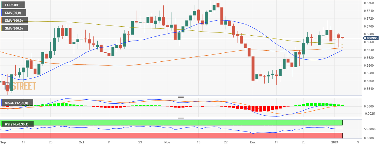 周二盘中,欧元/英镑徘徊在 0.8670 附近,在 0.8645 附近的低点获得支撑后略有回落。日缐图显示,多空双方争夺主导,前景中性偏向看涨,即使看涨动能趋于平缓。然而,4小时图显示,技术指标已经趋于平缓,显示欧元/英镑可能会维持下行倾向。