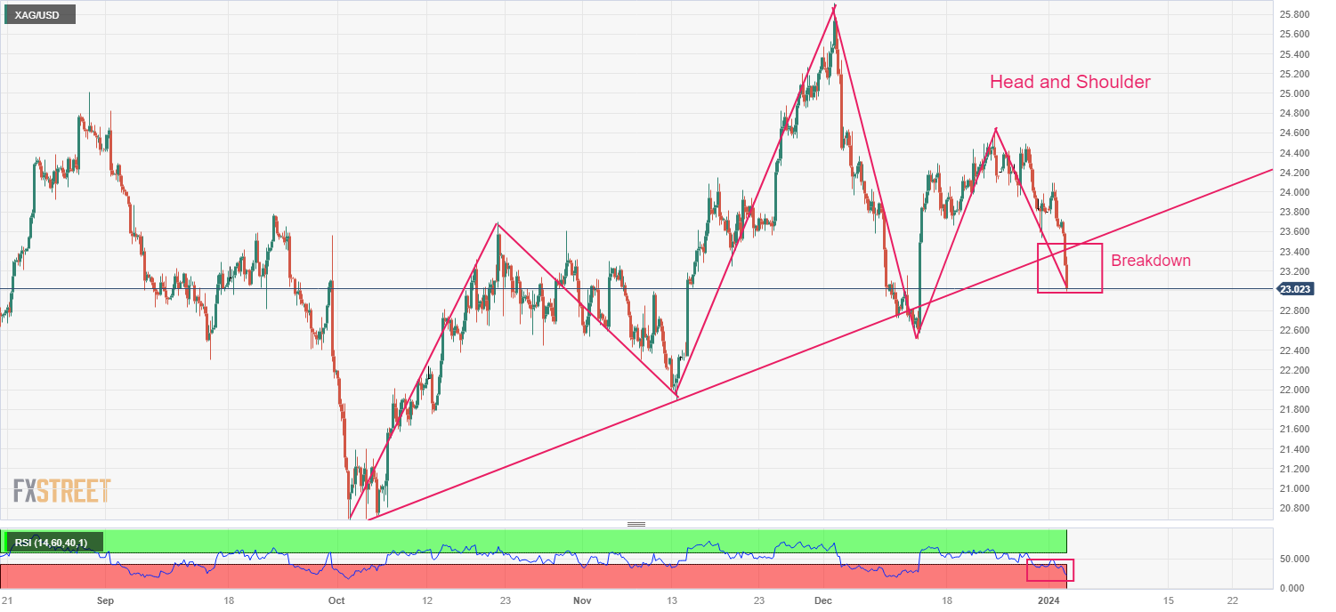 白银价格在跌破四小时缐形成的 "头肩顶 "图表形态后急剧下跌。相对强弱指数(RSI)(14)已进入 20.00-40.00 的看跌区间,这表示看跌势头已被触发。
