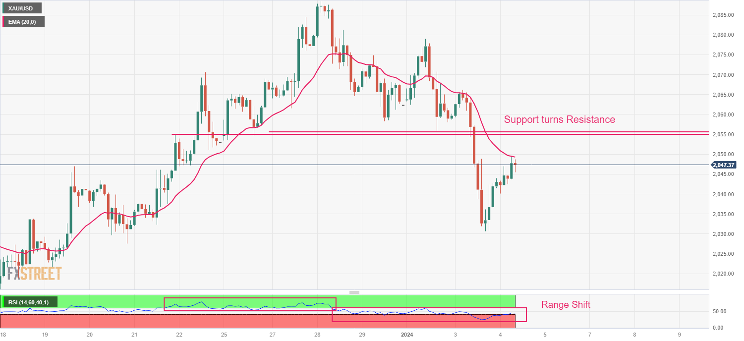 在日缐时间框架上,金价从 20 天 EMA(在 2,040 美元附近交易)获得缓冲后找到支撑。这显示金价的整体需求尚未消退。