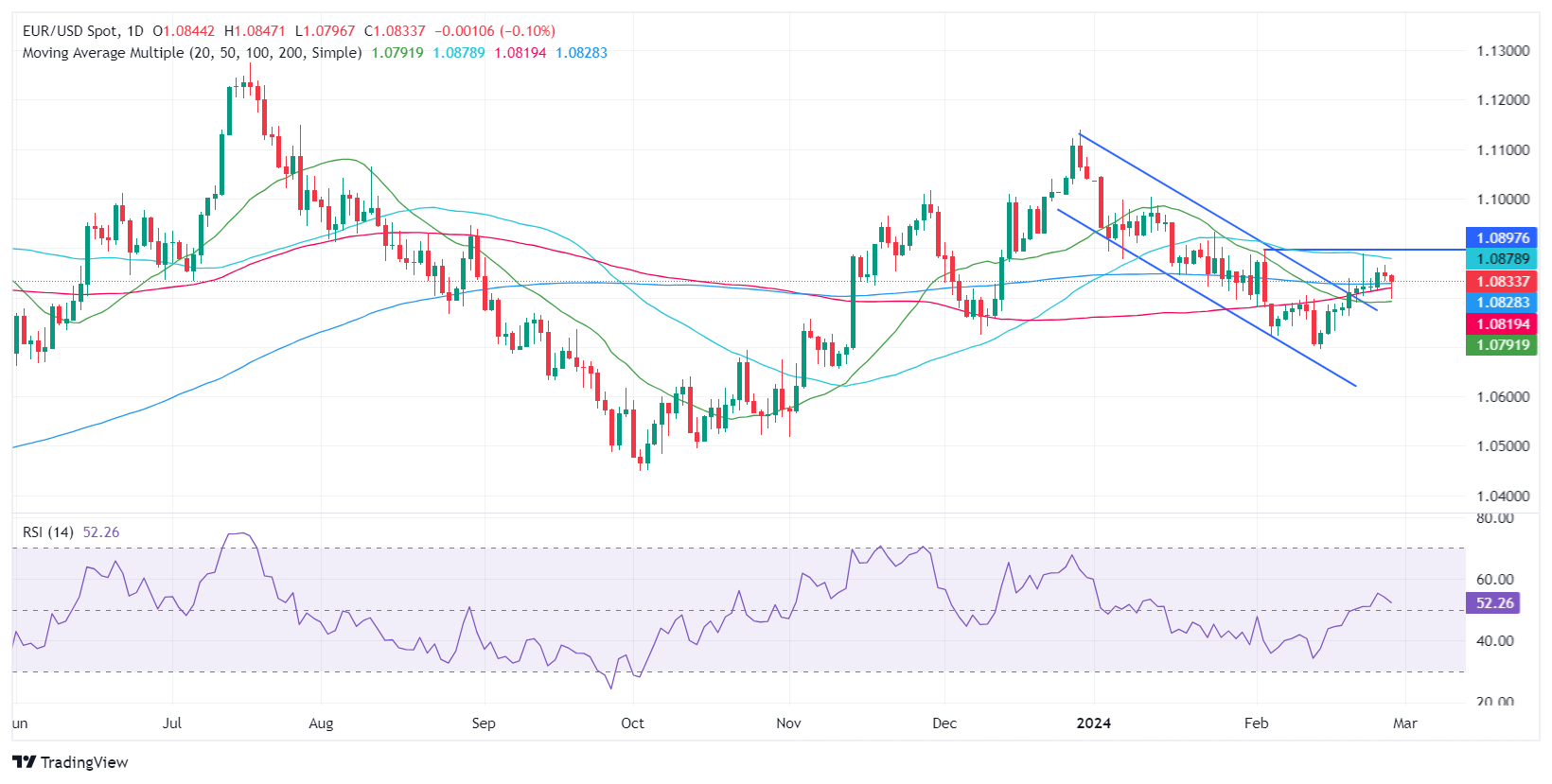 欧元兑美元连续第二日下跌,因為投资者在评估美国近期数据时发现美国经济依然强劲。截至发稿时,欧元兑美元下跌0.12%,报1.0830。
