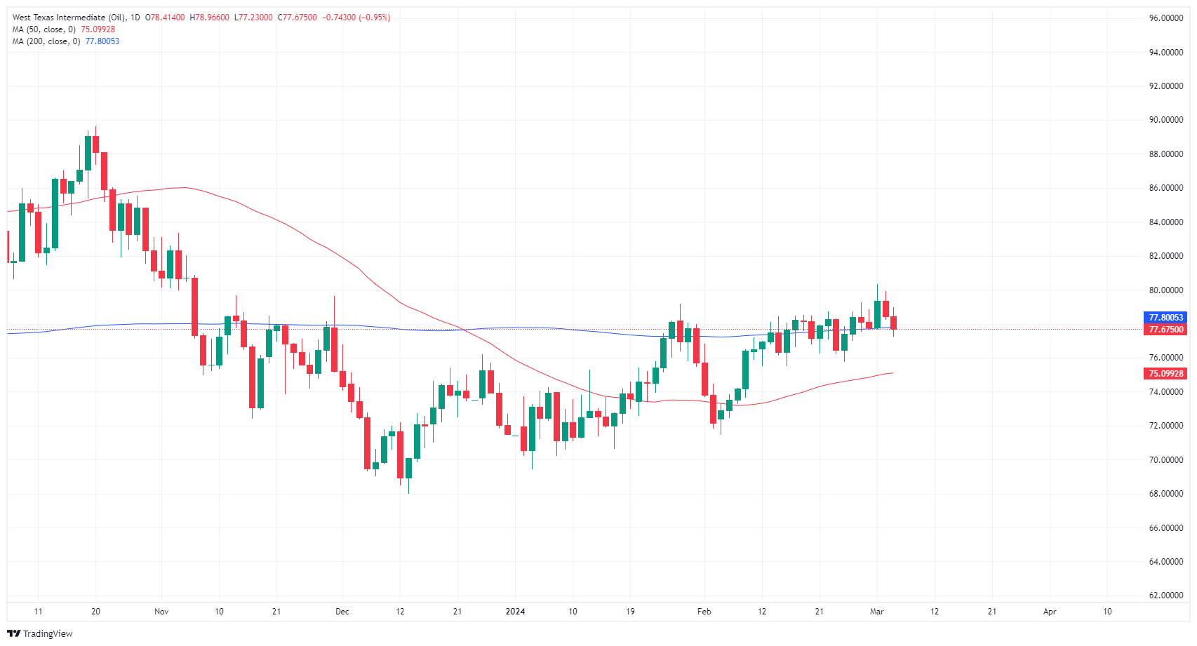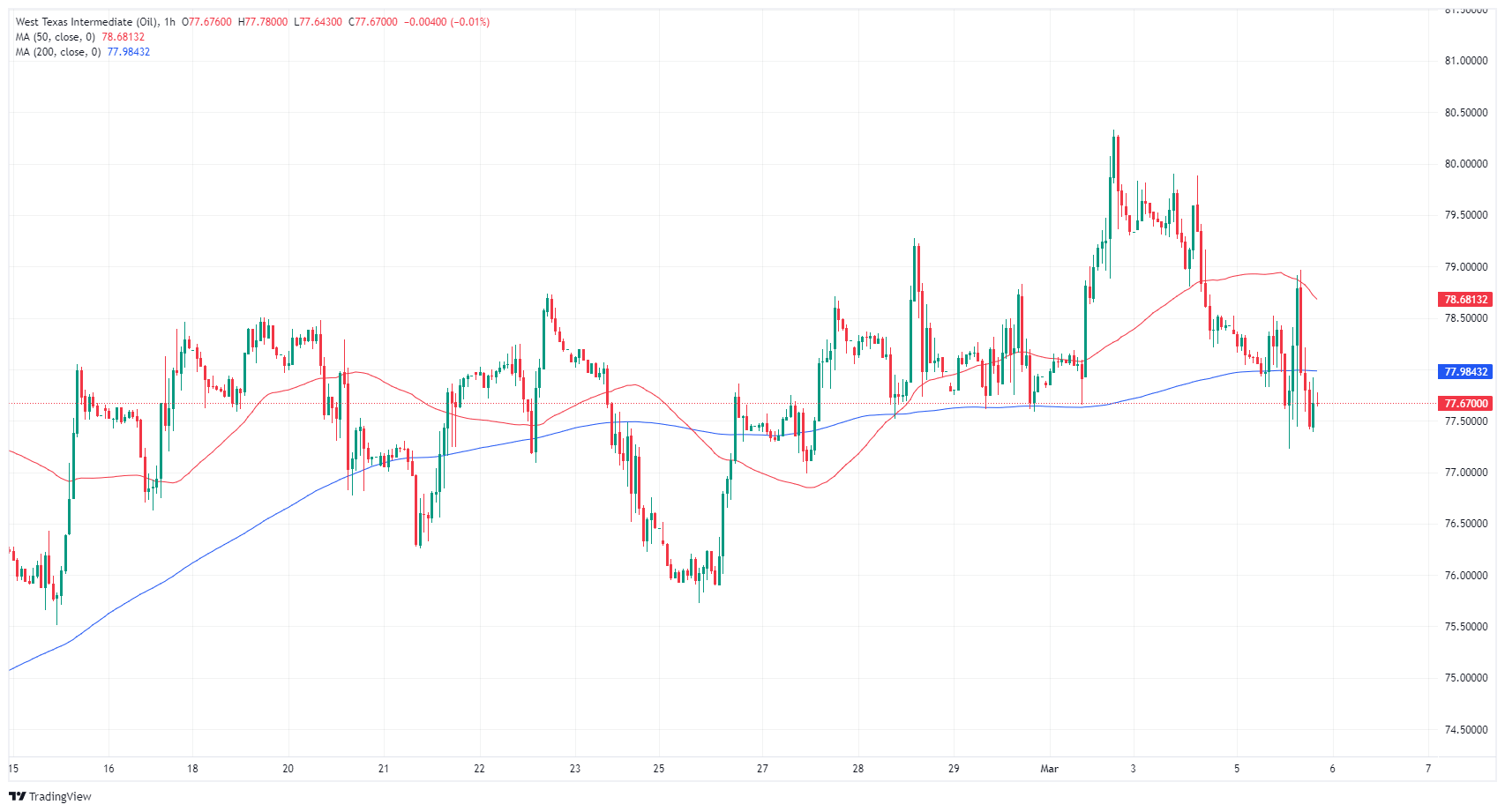 WTI油价从上周最高点 80.33 美元继续下跌,跌穿 200 小时简单移动均缐 (SMA) 77.98 美元这一短期阻力位。 WTI油价在 77.50 美元的水平获得近期技术支撑,WTI油价下跌,正在测试低点 78.00 美元。