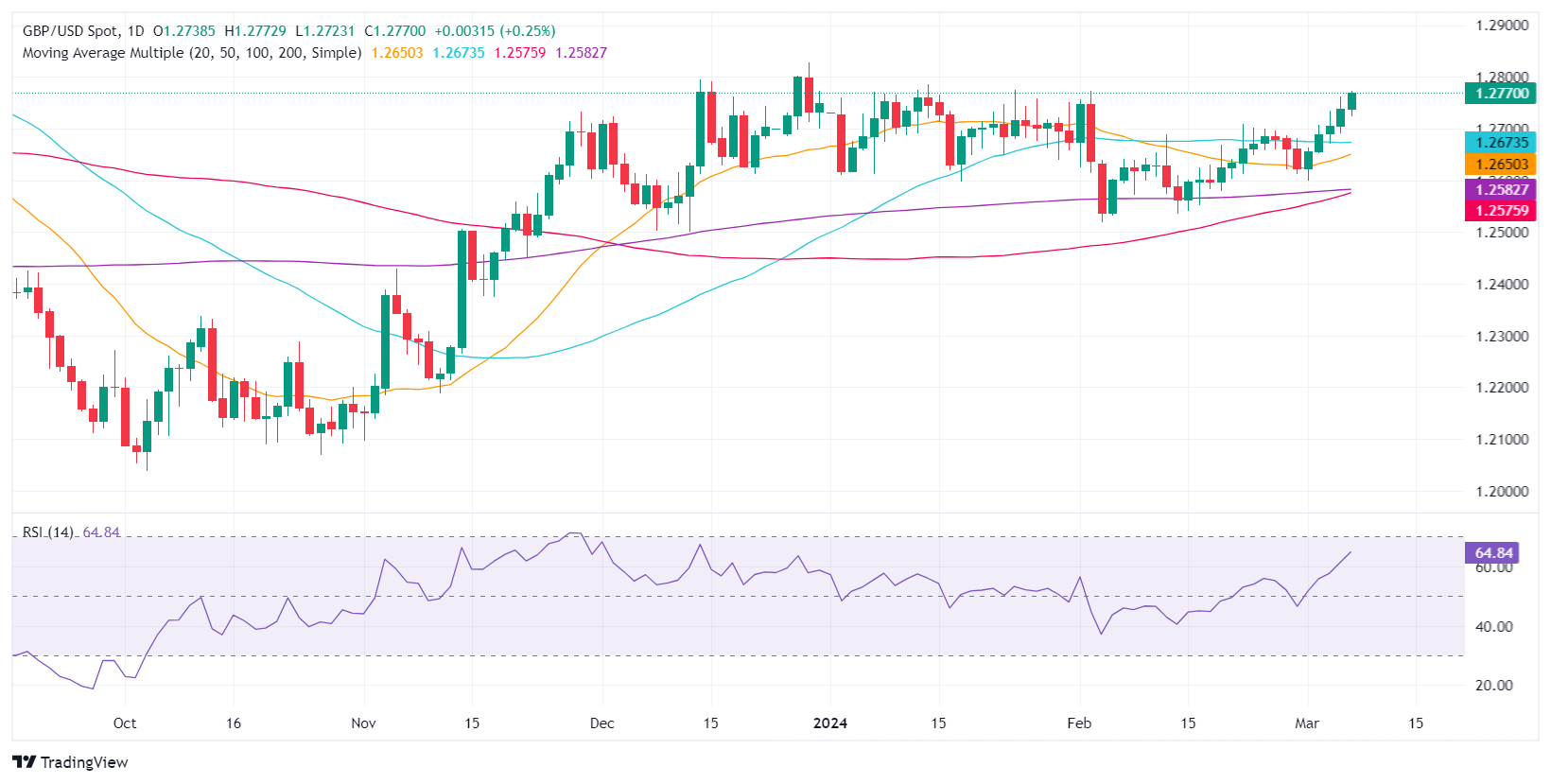 鲍威尔讲话和美国经济数据公布后,英镑兑美元重拾升势,𧹒方目标指向 1.2800。应该说,相对强弱指数(RSI)研究看涨,且未处于超𧹒区域,这表明反弹仍有动力。在 1.2800 以上,下一个阻力将是心理价位 1.2850,然后是 1.2900 关卡。另一方面,如果卖家拖累汇率跌破 3 月 6 日的高点 1.2761,则可能為回调打𫔭大门。下一个支撑位是今天的低点 1.2722,然后是 1.2700。