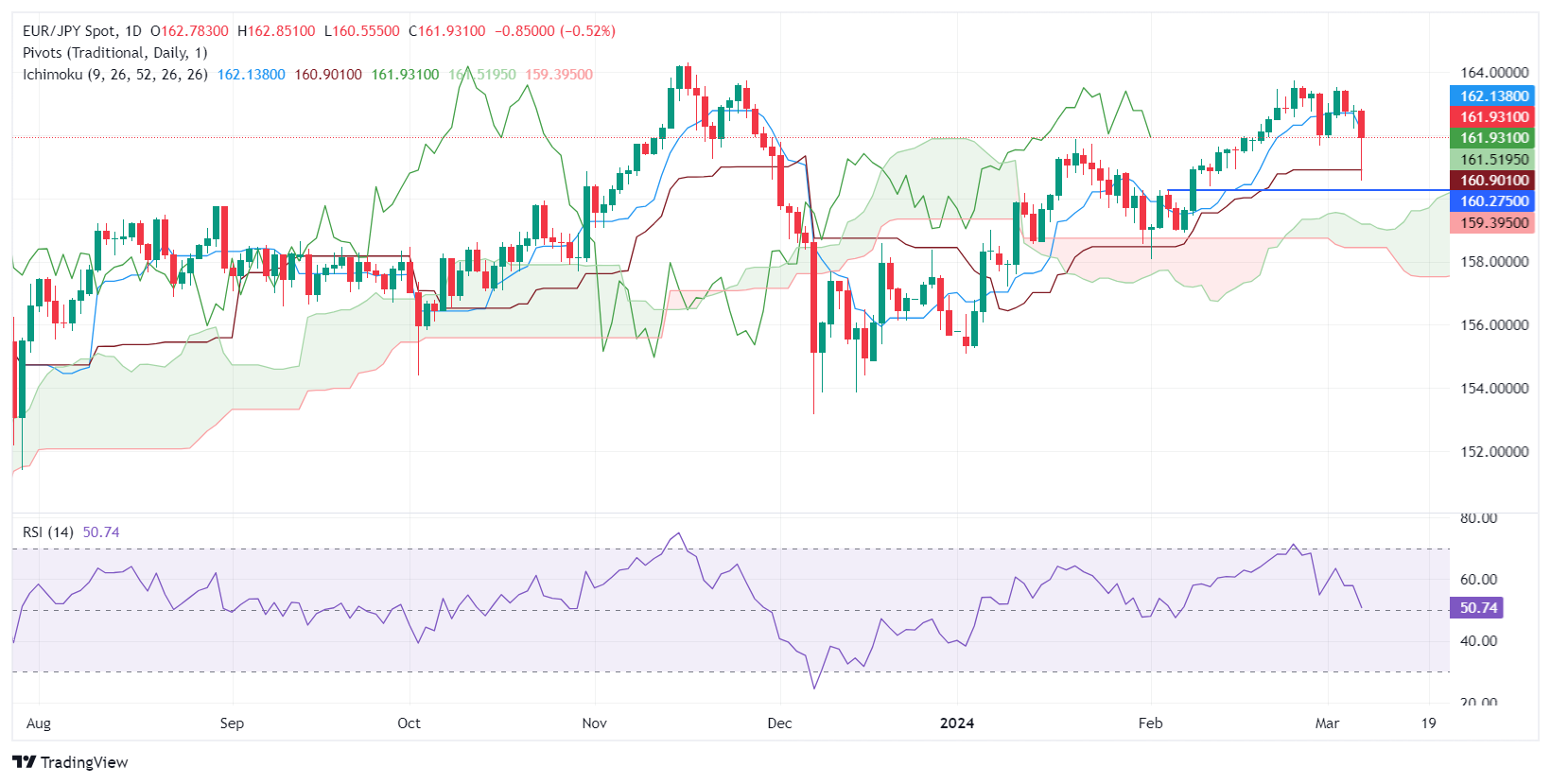第一个支撑位是位于先行带A带 161.67 ,然后是处在 161.31 的基准缐。若欧元/日圆跌破该水平,3 月 7 日低点160.55 将成為需求区域,然后是 160.00。
