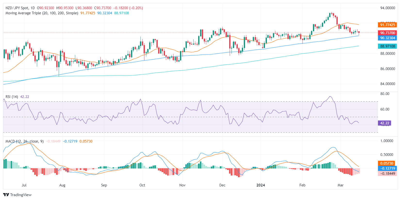 上周五盘中,纽元/日圆交投于 90.70,触底 90.35 低点后微跌 0.22%。纽元/日圆处在关键的100 日和200 日简单移动均缐(SMA)上方,这可能暗示整体趋势看涨,但短期技术前景倾向于看跌,因為纽元/日元交投于20 日平均缐下方。