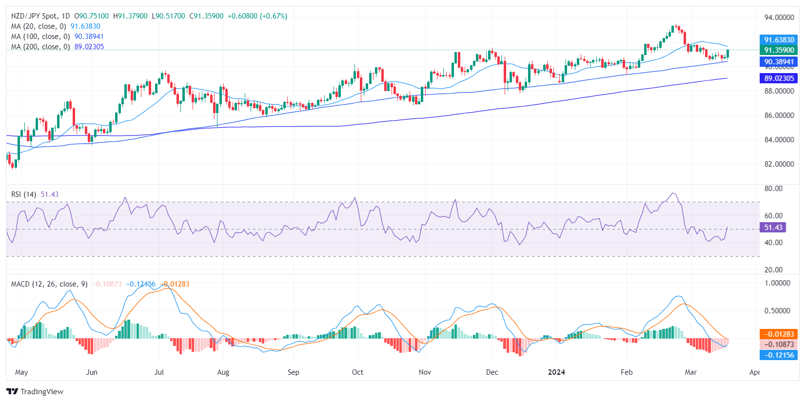 日缐图显示,纽元/日圆从消极区域转向积极势头。相对强弱指标目前位于正区 52 ,而异同移动平均缐(MACD)指标红柱回落,预示看跌动能可能减弱。
