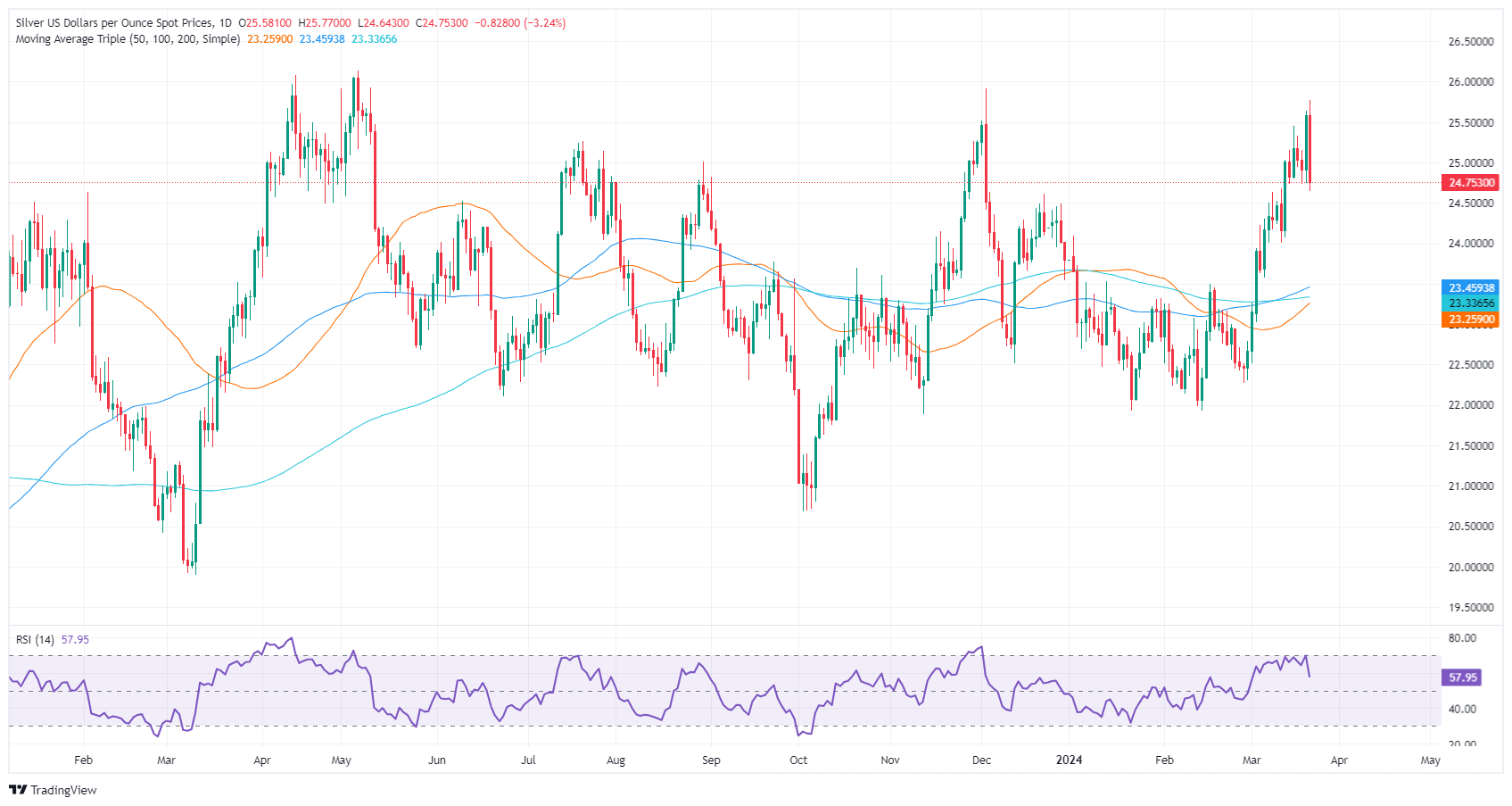 另一方面,如果银价日缐收盘于 25.00 美元上方,则可能為挑𢧐年缐高位 25.77 美元铺平道路,然后是去年高位 25.91 美元。