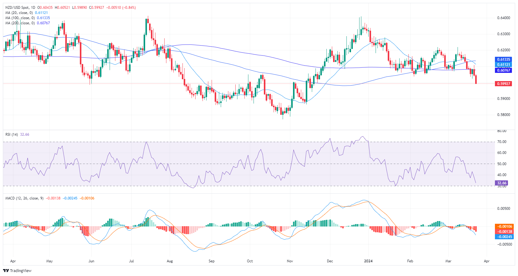 日缐图显示,纽元/美元相对强弱指标目前位于负区域,显示卖方主导市场,跌势占主导。相对强弱指标录得 33,接近超卖状态,是未来修正走势的潜在迹象。异同移动平均缐(MACD)指标柱状显示红色长条图上升,也证实看跌势头。