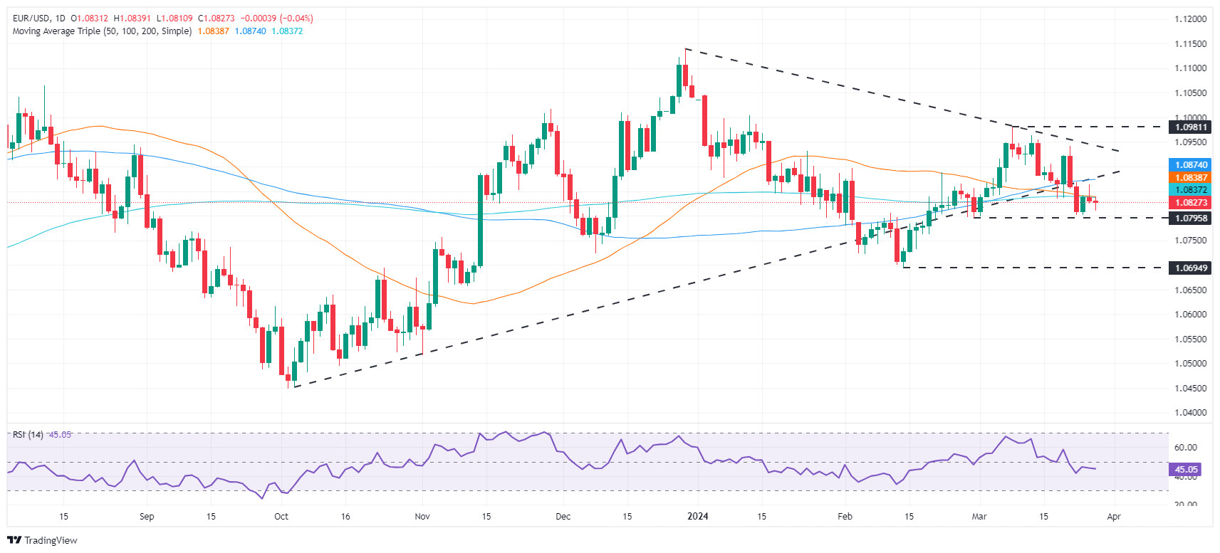 衡量一篮子美国货币对其他六种货币的 DXY 指数几乎没有变化,為 104.29。美债殖利率下降使欧元兑美元未跌破 1.0800,否则可能会进一步下跌。