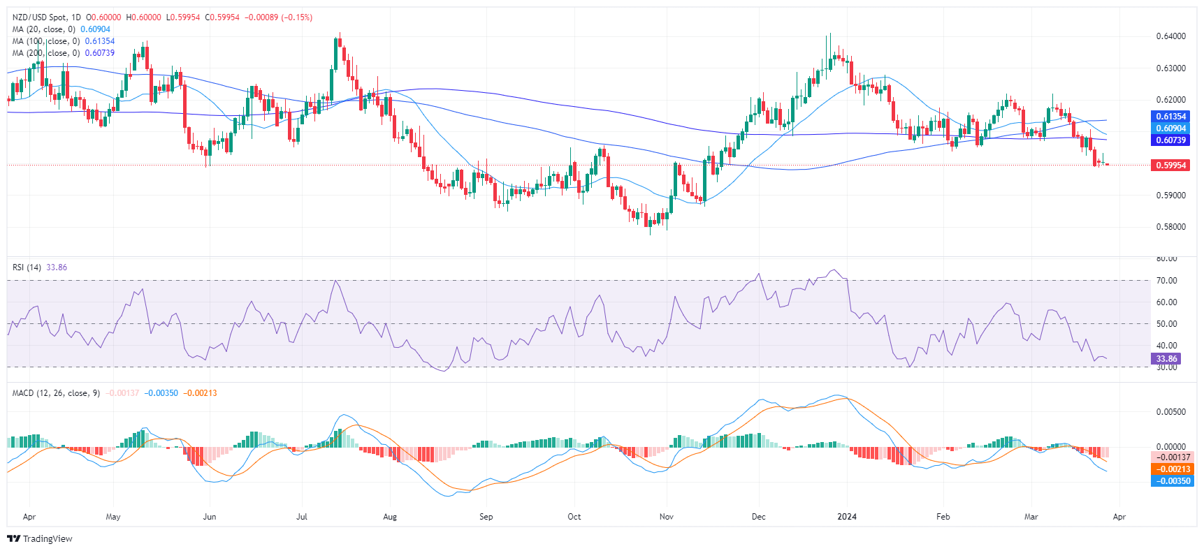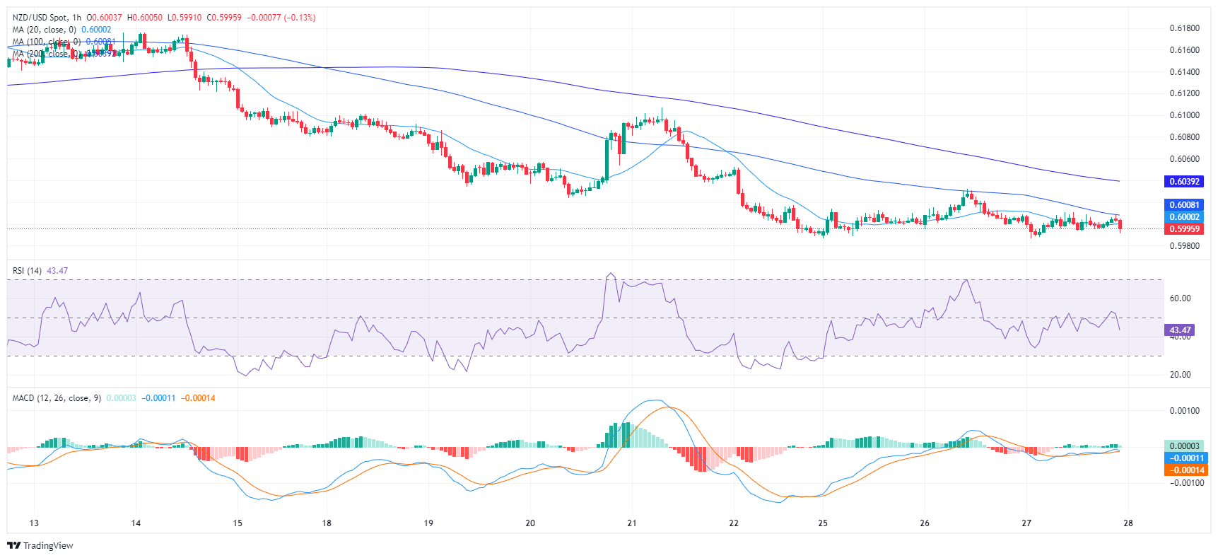 纽元/美元在0.6000附近震盪下行,市场格局主要由空头主导,维持整体看跌趋势。纽元/美元位于重要的 20 日、100 日和 200 日简单移动均缐 (SMA) 下方,强调了空头强势存在。不过,小时图上有可能出现短期看涨反转的缐索。
