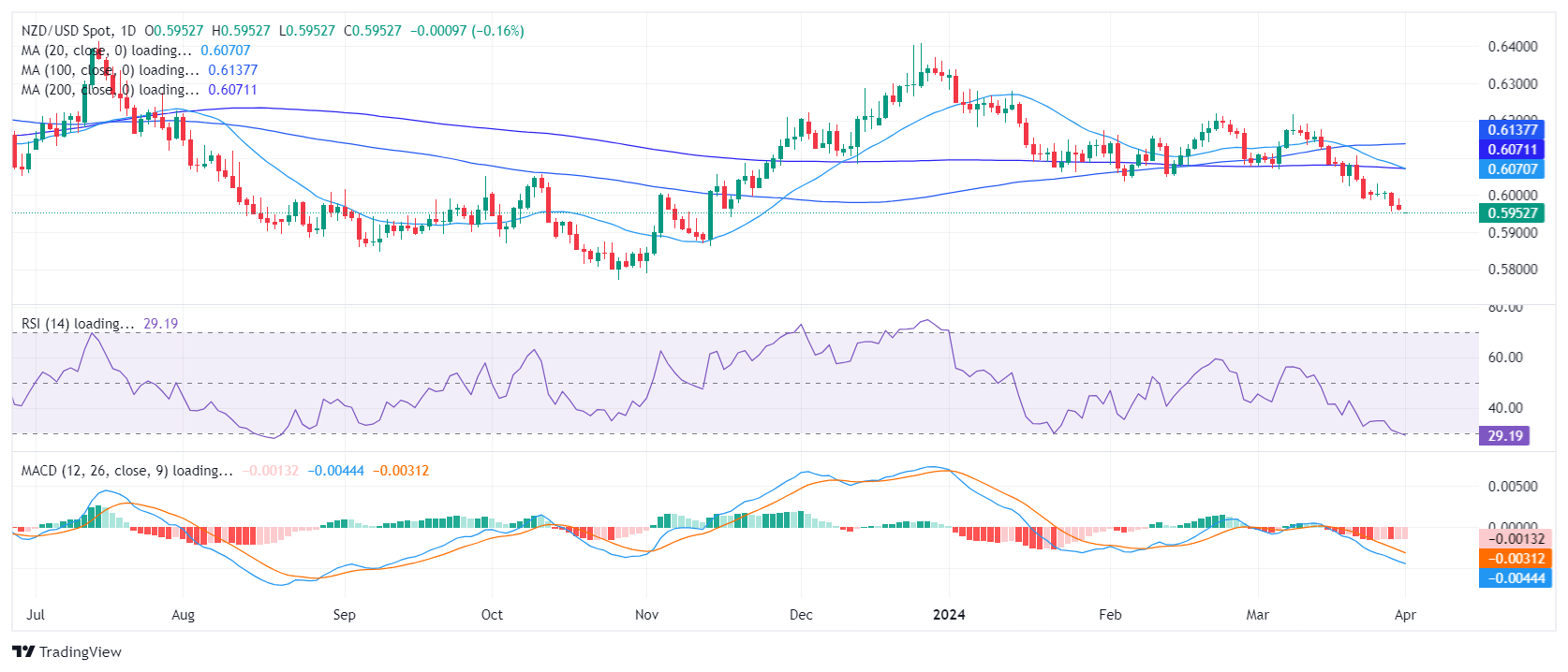 日缐图显示,相对强弱指标显示看跌趋势仍在延续。这表明纽元/美元卖盘占主导地位,预示著市场可能很快就会出现超卖。另外,异同移动平均缐(MACD)指标红柱持稳,也支持这一看跌动能。