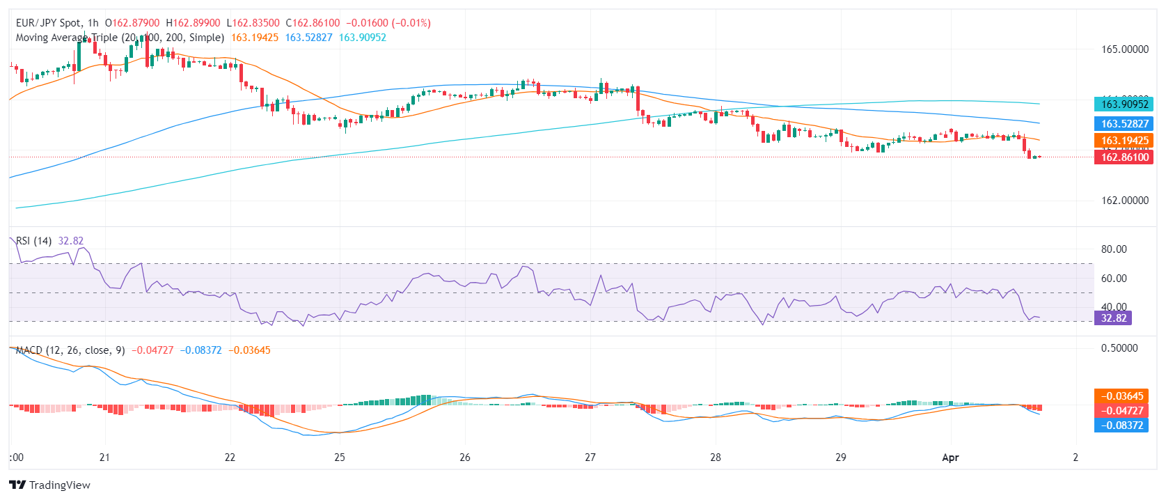 欧元/日圆货币对目前交投于 162.85 附近,周一盘中下跌了 0.30%。从做空动能加大可以看出,看跌讯号正在加剧,这预示著先前的看涨趋势可能会出现反转。