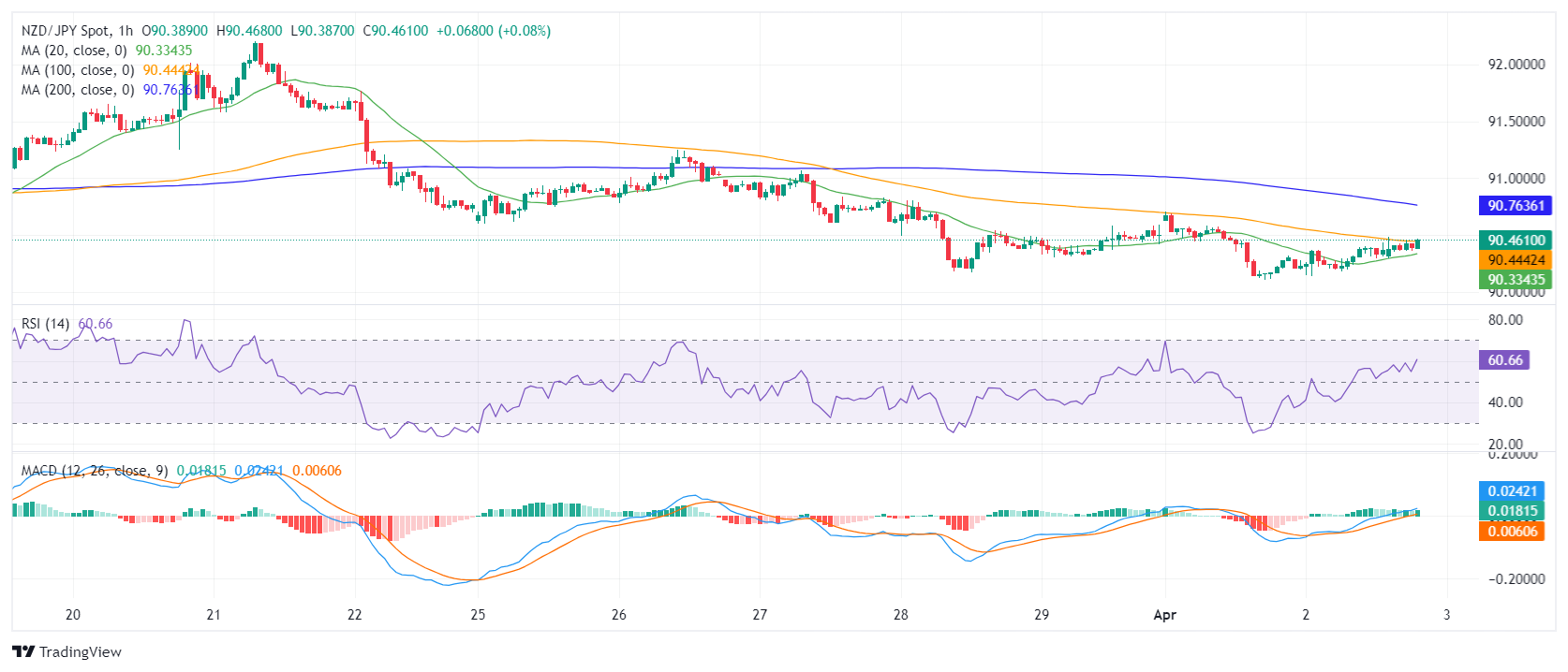 周二盘中,纽元/日圆小幅上涨至 90.42,涨幅為 0.16%。也就是说,空头在市场大环境中仍占主导地位,暗示看跌情绪顽固。但令人欣慰的是,小时图技术指标显示纽元/日圆可能会出现短期看涨整理,显示𧹒方维持一定的韧性。
