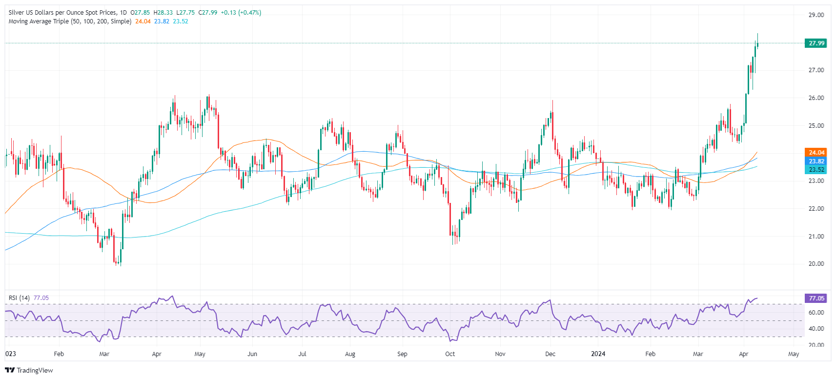白银价格预测:白银/美元飙升至 28.00 美元上方的近三年峰值