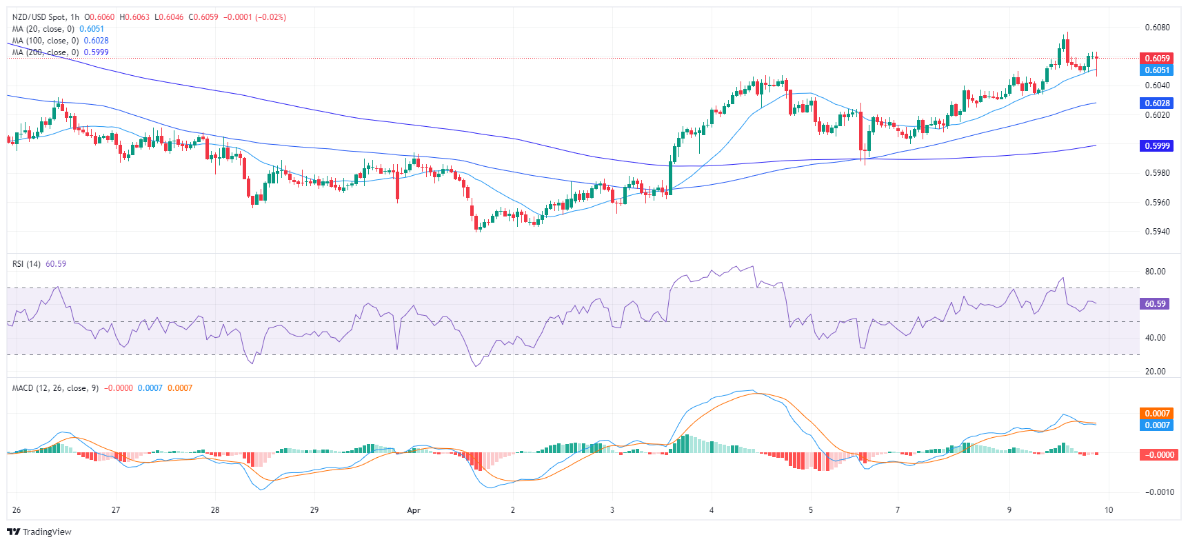 纽元兑美元升至 0.6058 附近,周二盘中涨幅為 0.41%。侭管纽元/美元动能从看跌转為看涨,但处于关键的简单移动均缐(SMA)下方,暗示可能会延续跌势。
