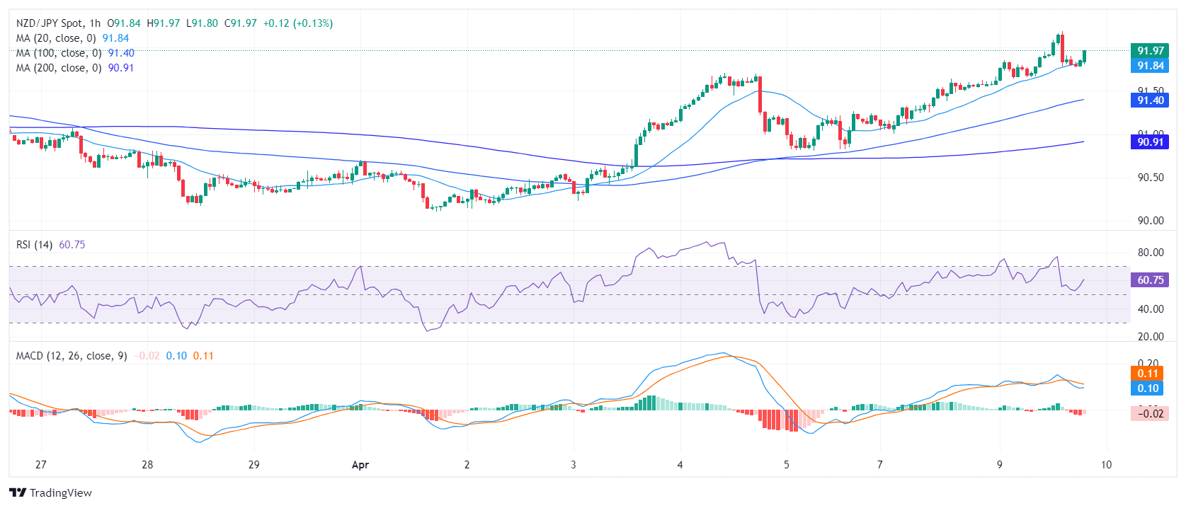纽元/日圆目前交投于 91.79,上扬了 0.25%。目前,纽元/日圆出现强劲的看涨走势,𧹒盘动能增强,因為纽元/日圆稳稳地位于主要简单移动均缐(SMA)上方。日缐图技术指标依然强劲,而小时图指标可能暗示即将出现盘整。