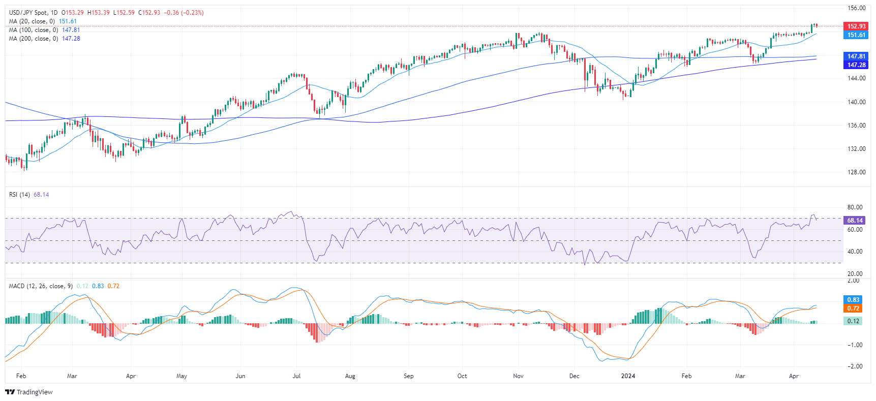 美元/日圆货币对目前交投于 152.95 点,小幅下跌 0.17%。侭管密西根大学(UoM)消费者信心指数(Consumer Sentiment Index)显示美国消费者信心下降,但由于周三和周四报告的通膨数据火热,本周美元兑日圆将收涨。