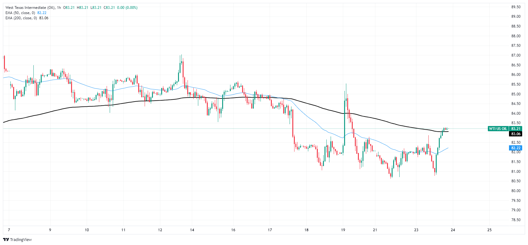 WTI油价从周二低点 81.00 美元紧下方反弹后,突破 83.00 美元。当天稍晚WTI油价反弹使美国 原油价格在 200 小时指数移动均缐 (EMA)紧上方。