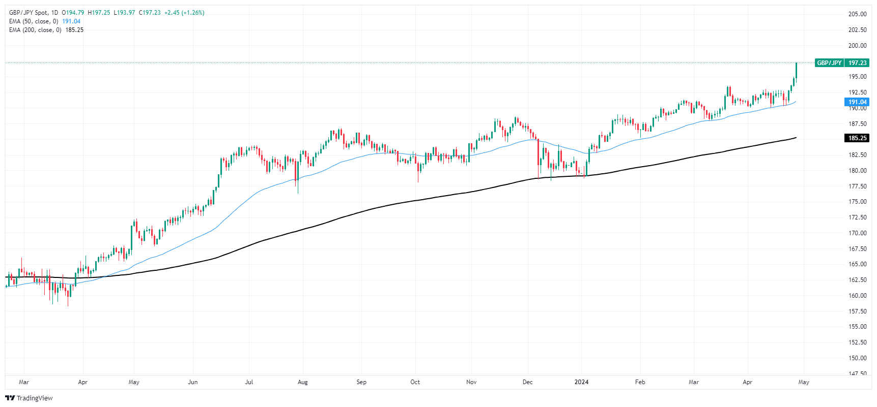 随著英镑/日圆进入 16 年高位,正突破 197.00 关口,进入极度看涨的图表区域。英镑/日圆自 2024 年初从 180.00 附近的 200 天指数移动均缐 (EMA) 反弹以来,已经上涨了 10.2%。