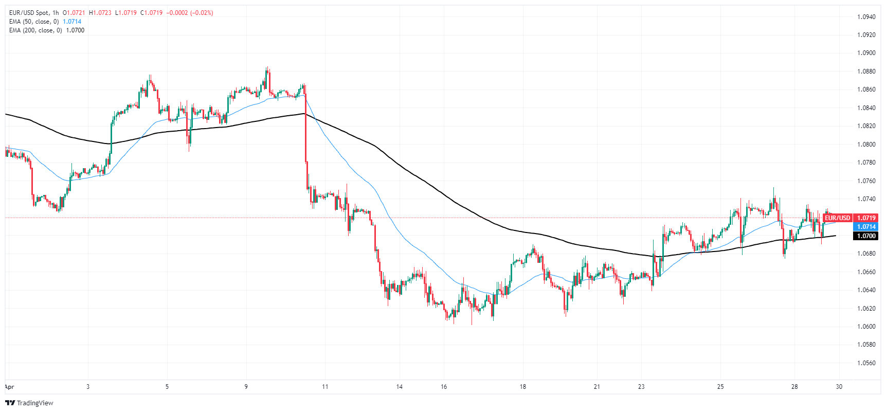 欧元兑美元周一处在1.0700关口上方,从200小时指数移动均缐(EMA)升至1.0700区域后继续走高。事实证明,1.0750 上方构成强阻力,下行势头虽然疲软,但仍持续打压欧元兑美元。